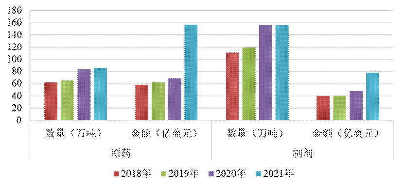 圖2 2018-2021年我國農(nóng)藥原藥和制劑出口情況