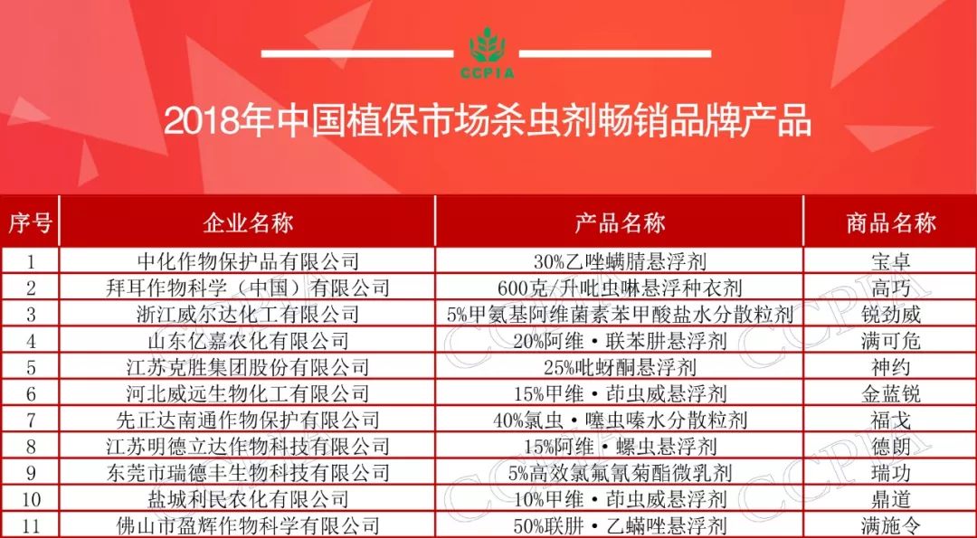 殺蟲劑暢銷品牌產品中,中化作物寶卓(30%乙唑螨腈懸浮劑)、拜耳高巧(600克/升吡蟲啉懸浮種衣劑)和浙江威爾達銳勁威(5%甲氨基阿維菌素苯甲酸鹽水分散粒劑)分別位列前三甲。同時山東億嘉滿可危(20%阿維.聯苯肼懸浮劑)、克勝集團神約(25%吡蚜酮懸浮劑)、河北威遠金藍銳(15%甲維.茚蟲威懸浮劑)、先正達福戈(40%氯蟲.噻蟲嗪水分散粒劑)等殺蟲劑產品也蟾宮折桂。