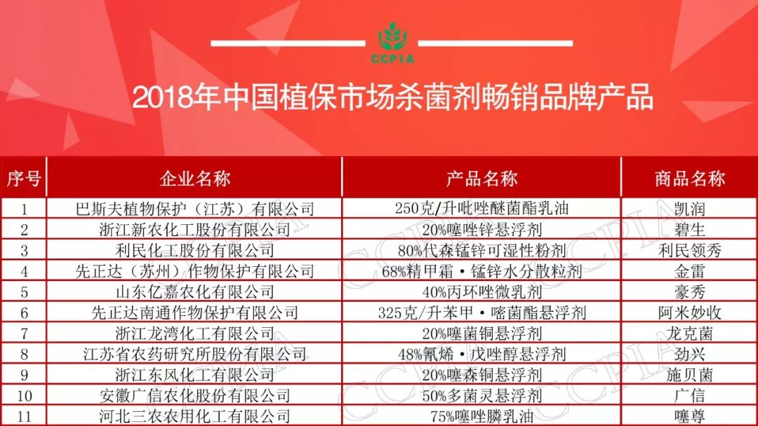 殺菌劑暢銷品牌產品中,巴斯夫凱潤(250克/升吡唑醚菌酯乳油)拔得頭籌,由我國自主創制的品種,新農股份碧生(20%噻唑鋅懸浮劑)和利民股份利民領秀(80%代森錳鋅可濕性粉劑)分別位列第二和第三。蘇研勁興(48%氰烯.戊唑醇懸浮劑)位列第八。山東億嘉的豪秀(40%丙環唑微乳劑)、浙江龍灣龍克菌(20%噻菌銅懸浮劑)、廣信農化廣信(50%多菌靈懸浮劑)等制劑產品也榜上有名。