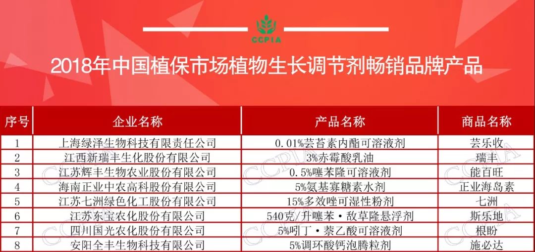 植物生長調節劑暢銷品牌產品中,上海綠澤蕓樂收(0.01%蕓苔素內酯可溶性液劑)、江西新瑞豐瑞豐(3%赤霉酸乳油)繼續蟬聯榜單第一第二的位置,江蘇輝豐能百旺(0.5%噻苯隆可溶液劑)位列第三,四川國光、江蘇七洲、安陽全豐等企業的制劑產品也榜上有名。