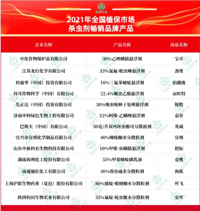 殺蟲劑暢銷品牌產(chǎn)品中,中化作物寶卓(30%乙唑螨腈懸浮劑)、江蘇龍燈勁勇(33%氯氟.吡蟲啉懸浮劑)、科迪華佰靚瓏(10%三氟苯嘧啶懸浮劑)等產(chǎn)品進入名單。