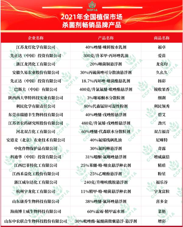 殺菌劑暢銷品牌產(chǎn)品中,江蘇龍燈福卓(40%唑醚.咪鮮胺水乳劑)、先正達(蘇州)愛苗(300克/升苯甲.丙環(huán)唑乳油)、浙江龍灣龍克均(20%噻菌銅懸浮劑)、等產(chǎn)品進入名單。