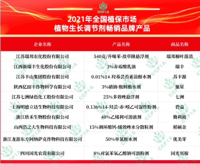 植物生長調(diào)節(jié)劑暢銷品牌產(chǎn)品中,江蘇瑞邦農(nóng)化瑞邦棉葉落清(540克/升噻苯.敵草隆懸浮劑)、江西新瑞豐瑞豐(3%赤霉酸乳油)、豐山集團蘇豐源(0.01%14-羥基蕓苔素甾醇水劑)等產(chǎn)品進入名單。