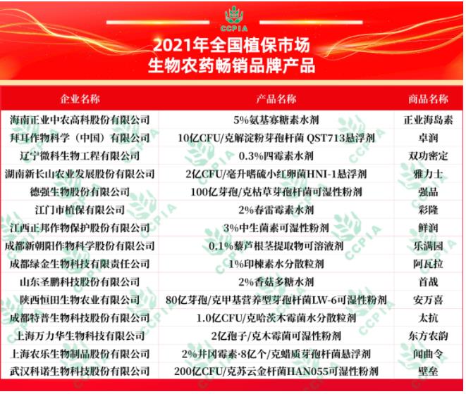 生物農(nóng)藥暢銷品牌產(chǎn)品中,海南正業(yè)正業(yè)海島素(5%氨基寡糖素水劑)、拜耳作物卓潤(10億CFU/克解淀粉芽孢桿菌 QST713懸浮劑)、遼寧微科雙功密定(0.3%四霉素水劑)等產(chǎn)品進入名單。