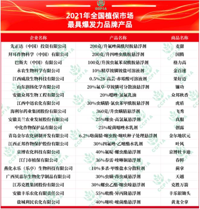 根據(jù)中國農(nóng)藥工業(yè)協(xié)會生產(chǎn)信息調(diào)度及綜合審定,最終除草劑暢銷品牌產(chǎn)品10個、殺蟲劑暢銷品牌產(chǎn)品13個、殺菌劑暢銷品牌產(chǎn)品21個、植物生長調(diào)節(jié)劑暢銷品牌產(chǎn)品10個、生物農(nóng)藥暢銷品牌產(chǎn)品15個以及最具爆發(fā)力品牌產(chǎn)品20個,共計89個產(chǎn)品入選2021年全國植保市場暢銷品牌產(chǎn)品名單。