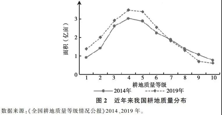 耕地質量保護與提升是現代農業生產中穩定糧食數量和保障糧食質量的核心,更是實現農業可持續發展的關鍵。人多地少的基本國情使得我國傳統糧食生產堅持高投入、超負荷模式,造成耕地質量呈現出中低產田面積大、退化面積大、污染面積大、有機質含量低、補充耕地等級低、基礎地力低的“三大三低”特征。根據2014年和2019年全國耕地質量等級情況公報,近年來我國平均耕地質量呈上升趨勢,但評價為7至10等的耕地約為5億畝(等級越高,質量越差),占耕地總面積的四分之一(圖2)。這部分耕地基礎地力相對較差,生產障礙因素突出,且難以在短時間內得到根本改善。分區域來看,東北黑土區耕地的主要問題在于黑土層變淺流失,土壤有機質不足;華北及黃淮平原潮土區耕地耕層變淺,部分地區土壤鹽漬化嚴重;長江中下游平原水稻土區耕地則面臨著土壤酸化、潛育化的風險,部分地區耕地還存在嚴重的重金屬污染現象;南方丘陵崗地紅黃壤區耕地同樣存在土壤酸化、潛育化的問題;西北灌溉及黃土型旱作農業區耕地則在面臨土壤鹽漬化的同時,還伴隨沙化和地膜殘留污染等問題。