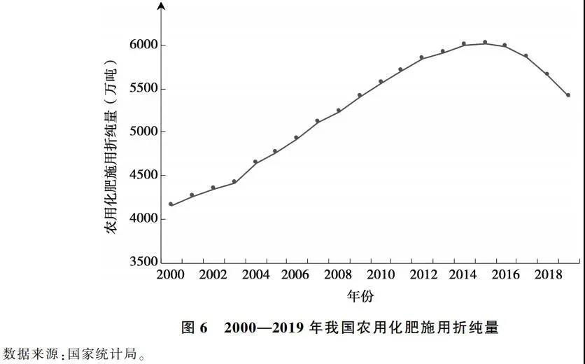 農業面源污染主要源于農用化學品過量施用、農業廢棄物的不合理處置等,防控和治理難度較大。就農用化學品投入而言,2015年我國農膜使用量260多萬噸,而回收利用率不足三分之二,2018年使用量略有下降,但仍然高達247萬噸(圖5)。農藥殘留會流入河塘、溝渠,污染水體,使農產品有毒物質超標;化肥的過量施用使得總磷、總氮等大量污染物進入水體及耕地土壤,污染地下水和耕地并對糧食質量安全、產地生態安全造成影響。盡管我國2015年實施的化肥農藥使用量零增長行動目標已于2020年底順利實現,但從總量上來看,農藥使用量、農用化肥施用折純量仍然不容樂觀(圖5、圖6)。就農業有機廢棄物而言,農作物秸稈、畜禽糞尿的不合理處置不僅對地表水、地下水造成污染,其大量堆積還會使得農田過肥,對其造成腐蝕,進而使農田質量降低乃至失去生產能力。據估計,僅2014年中國農作物秸稈資源量約為9.89億噸,畜禽糞尿資源量(鮮重)更是高達26.81億噸,而其中不少并未得到合理利用。