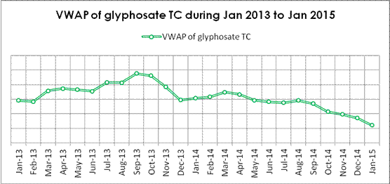 According to CCPIA monthly bulletin of statistics of China pesticides, in Jan 2015, volume weighted average (transaction) price of glyphosate TC fell by 13% month-on-month. Seen from the above chart, transaction price of glyphosate was basically going down throughout the year of 2014. Now the price is at the lowest point historically, even less than half of the highest point in 2013.