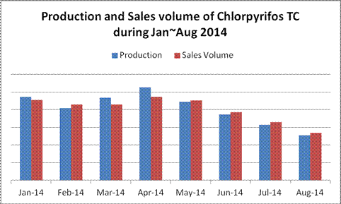 With the same number of manufacturers operating in Aug (compared with that of Jul), production of chlorpyrifos went down by 19.3% and sales volume dipped by 18.5% MoM. The rapid decline was caused by the hot weather for one aspect, and for another, according to some manufacturers, operation rate was reduced because they intend to control the sales channel in their own hands instead of the traders.