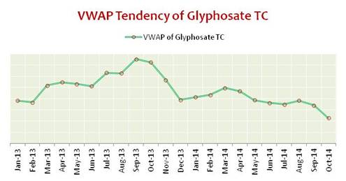 According to CCPIA monthly bulletin of statistics of China Agrochemicals, in October, VWAP (volume weighted average price) of glyphosate TC decreased by over 10% month-on-month, the largest drop during the past 22 months. Seen from the VWAP tendency chart, price of glyphosate TC kept on going down from March 2014, even though there was a slight increase in Jul because of the glyphosate scrutiny result came out, the overall trend didn’t change.