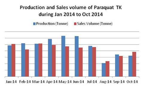 According to CCPIA monthly bulletin of statistics of China Agrochemicals, in October, VWAP (volume weighted average price) of paraquat TK increased by 5% month-on-month. Overall, except for the first quarter’s quick increase, price trend of paraquat TK performed stably in 2014. However, since it’s not purchasing season for paraquat now, it’s estimated that price of paraquat will dip down in the next few months, and price of the main raw material, pyridine is also unoptimistic.