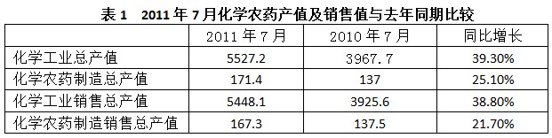 根據(jù)國家統(tǒng)計局統(tǒng)計,2011年7月份化學(xué)工業(yè)總產(chǎn)值5527.2億元,去年同期3967.7億元,同比增長39.3%,其中,化學(xué)農(nóng)藥制造7月份產(chǎn)值是171.4億元,去年同期137.0億元,同比增長25.1%,處于化工行業(yè)增長率最低。