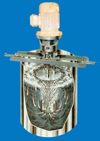 尚貴最新引進國外技術,開發研制出新一代高速高效大動力噴射式混合分散機。該機由主軸,機體和擋流板等部件組裝而成,當特殊設計的轉子在高速旋轉時,上部與下部之間產生強力的上竄力,致使料液從容器底邊及底角不斷湍流竄向混合區域,使料液經過混合區域定子/轉子處理后噴射上竄,沖出液面遇到上方的折流板的阻擋,使料液轉噴射到罐內四周壁邊降落,然后再回到罐內底部,如此反復循環無數次,由于特殊的結構部件,使料液在高速定子/轉子結構內產生強力的沖擊、剪切、擴散和湍流作用,能在極短時間內就可以實現混合、分散、剪切功能。